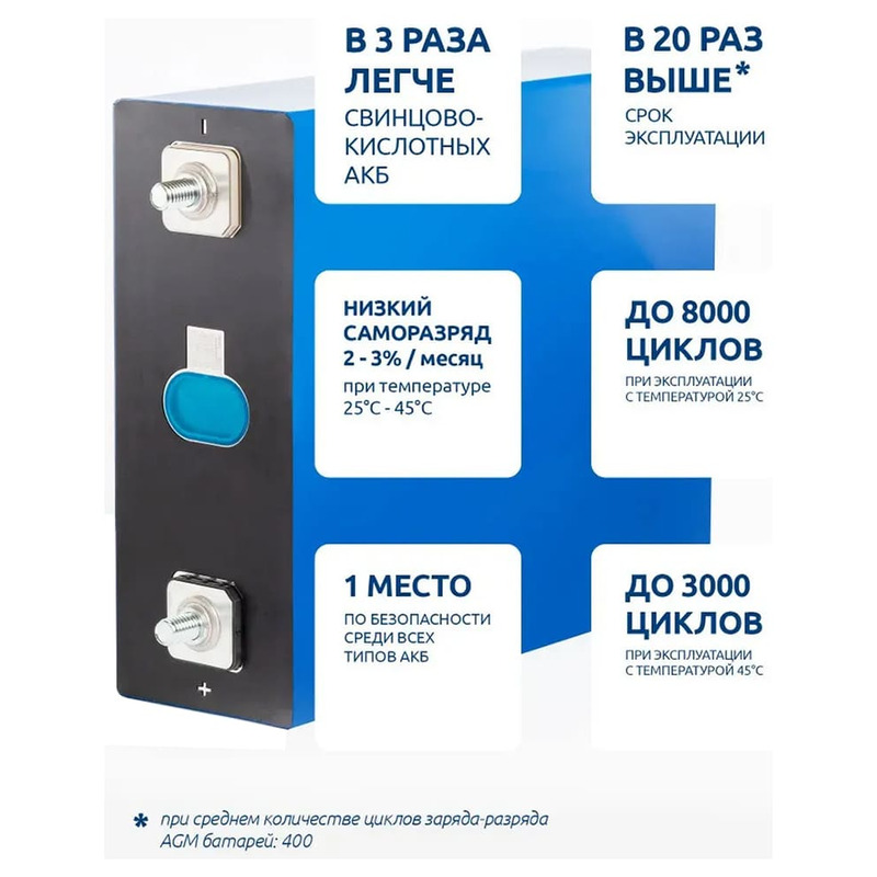 • Высокая плотность энергии по сравнению со свинцово-кислотными АКБ